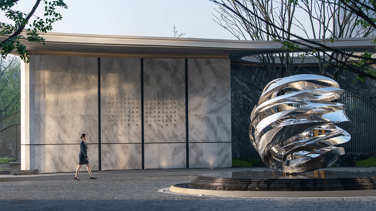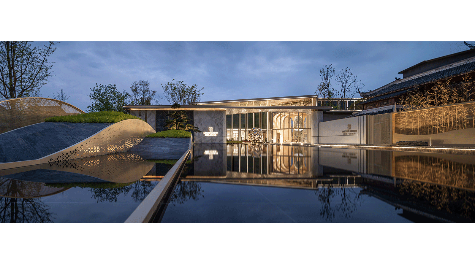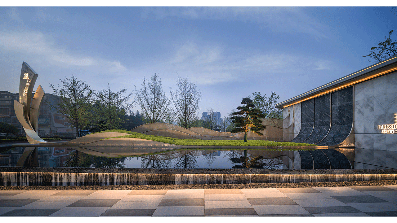 设计师思考以当地文化底蕴为基调,尝试捕捉现代城市与周边古商业街、泉湖公园叁者之间的共鸣,借泉湖公园自然之意,融合之精神,提取凤凰、龙珠等元素,完成一场跨越古今的对话,开拓引领,传递城市之美,旨在打造继泉湖十一景后的泉湖第十二景——「龙韵和凤」,来营造符合现代美学的体验式景观。