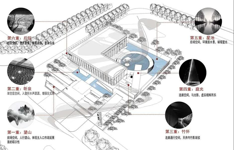 以“现代儒学意境”为设计理念,结合平潭岛县文化,运用现代化之潮流的设计手法,演绎出“遇水,登堂,寻境,庭光,星池,后院“的六重空间意境。