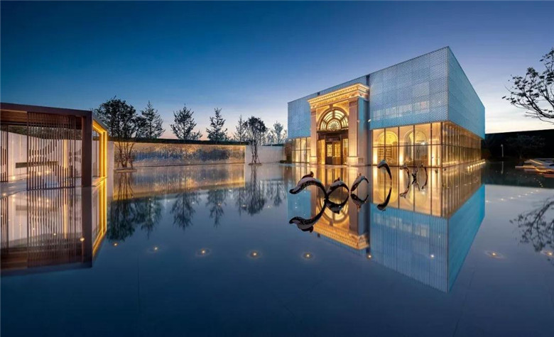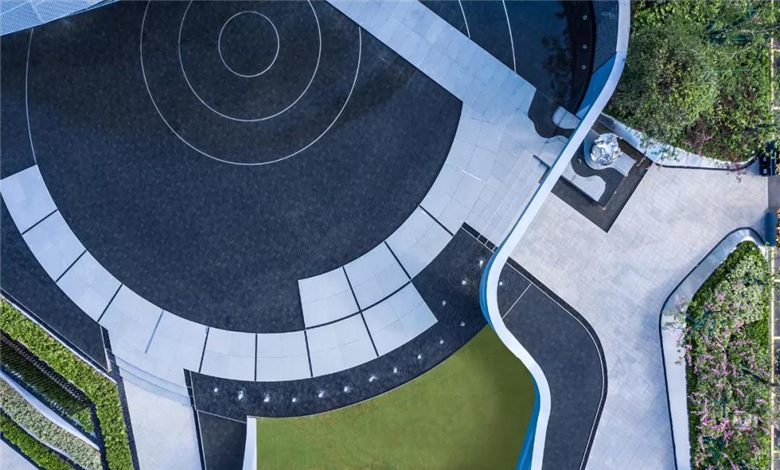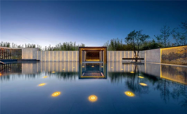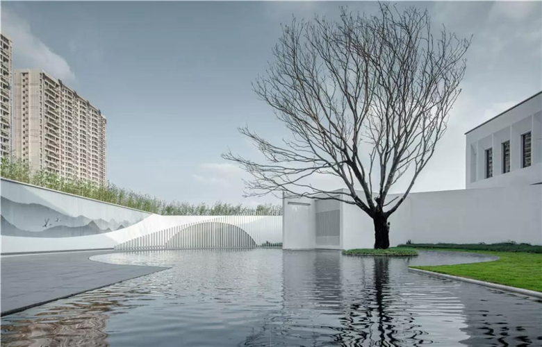 景墙与场地开阔水景互动而立,相映成辉,俨然一幅“天光云影共徘徊”的自然风光画面。