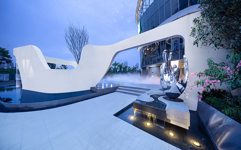 设计充分挖掘“水文化、航运文化”,与建筑“行云流水、水乡船韵”设计理念相呼应,延续建筑轮廓行云流水般的现代肌理。