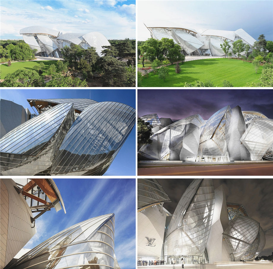 建筑表皮由一块巨大的预应力混凝土板所组成,从外观上看如同一个白色片状物组成的艺术装置(被称为“冰山”)。建筑周围12片巨大的玻璃“帆”由木结构梁支撑。“帆”表皮给予了路易斯威登博物馆以透明性和动态性----水、木结构和花园景观的反射以及不断变换的光影效果。