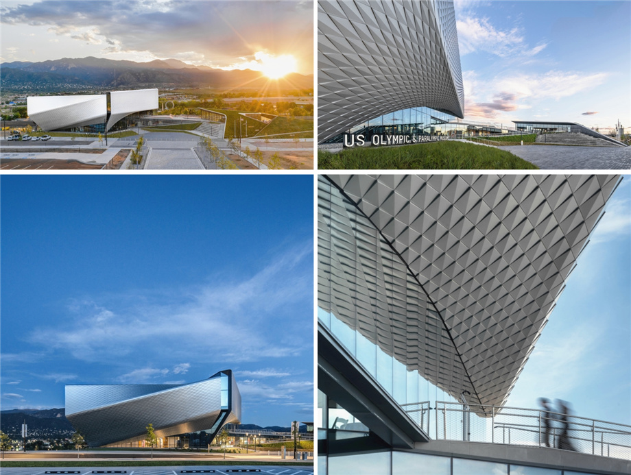 奥林匹克广场是一个硬质景观的梯田广场,位于博物馆综合体的中心。其南面是博物馆主楼建筑,北面是咖啡厅。建筑师在广场的设计中,试图再现派克斯峰和落基山脉在明信片上的视觉场景。建筑师设计了一个可容纳230人的圆形剧场,一年四季都可以满足各类活动的举办需求。